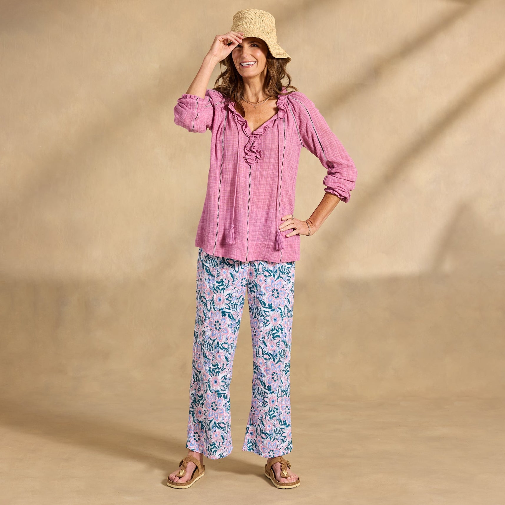 Embrace your artistic spirit in our sheer. easy-fit top with ladder lace. ruffle neckline and tassel ties. Cotton/viscose. Hand wash. Imported. Exclusive. Sizes XXS (00). XS (0?C2). S (4?C6). M (8?C10). L (12?C14). XL (16?C18). Approx. 24.5l