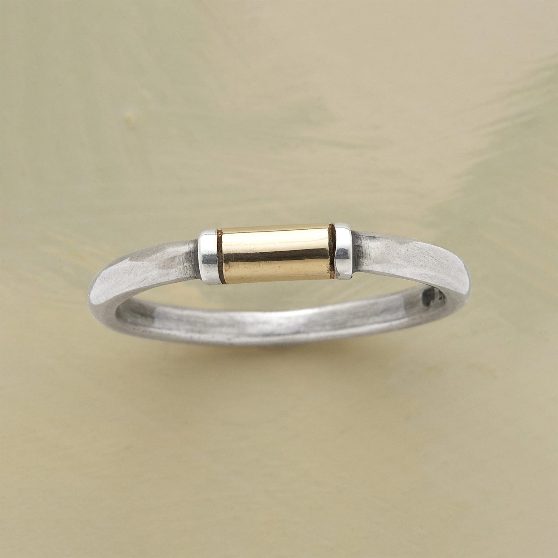 A gilt-wrapped ring. with a smoothly polished band of sterling silver that gains an extra glimmer with a 14kt gold center bar. Whole sizes 5-11.