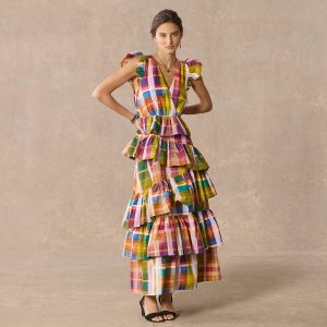 A bold madras plaid and asymmetrical. ruffled tiers make for a real statement piece. Ruffled cap sleeve. back tie at neck. Cotton. Dry clean. Imported. Sizes 2?C16. Approx. 55l.