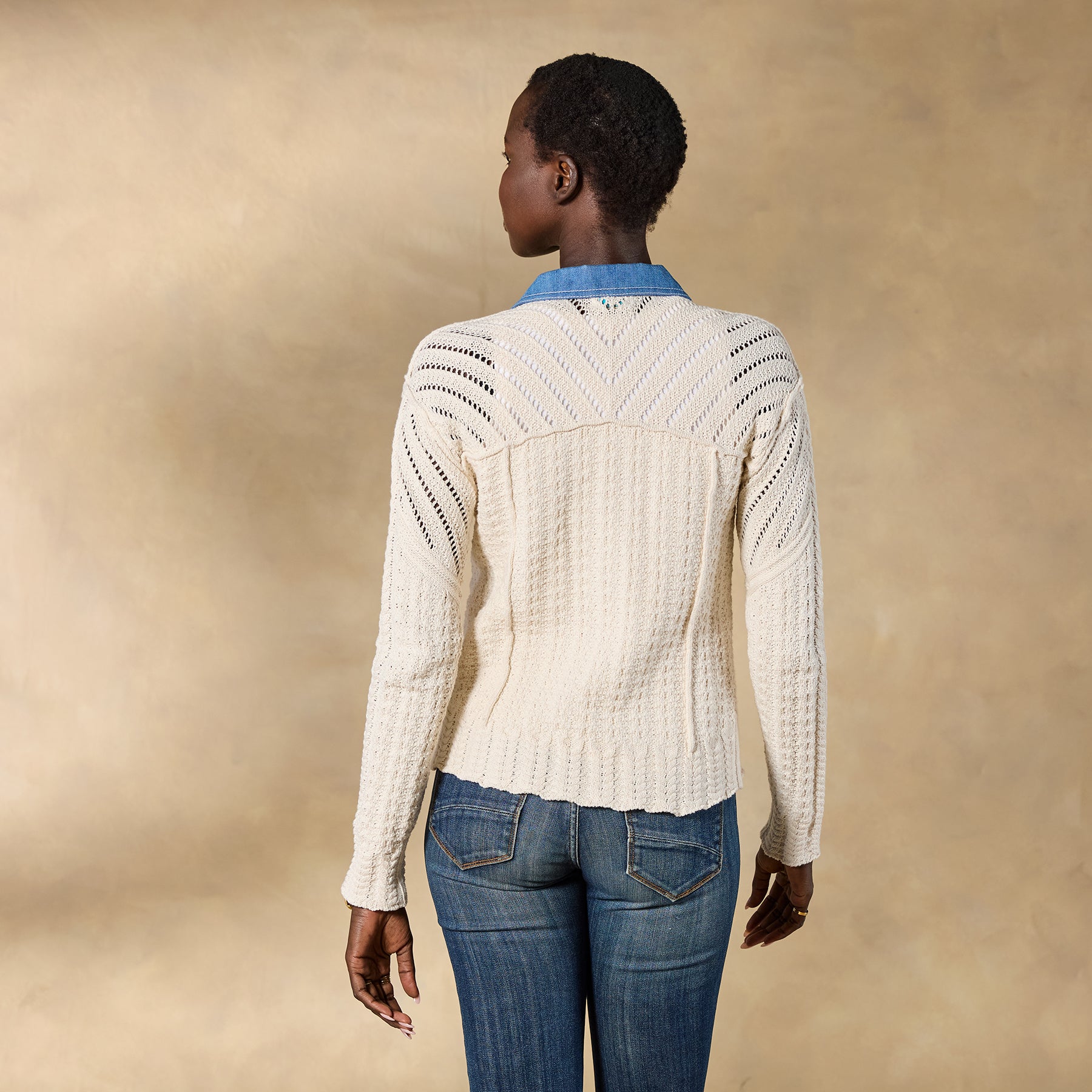 When you can’t decide between a cardigan and a denim jacket. reach for the Mesquite. This stylish mixed-media topper offers the best of both worlds. blending a super-soft sweater with denim accents. Cotton. Hand wash. Imported. Exclusive. Sizes XS (0?C2). S (4?C6). M (8?C10). L (12?C14). XL (16?C18). XXL (20?C22). Approx. 21l.