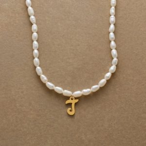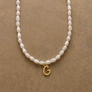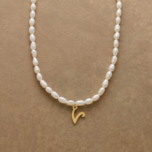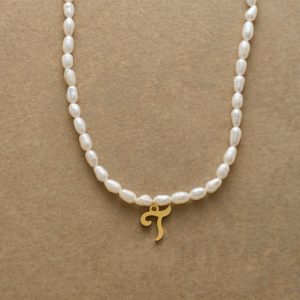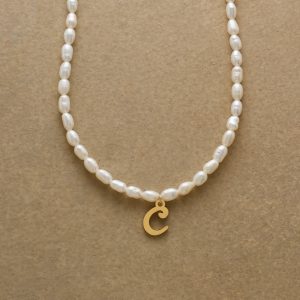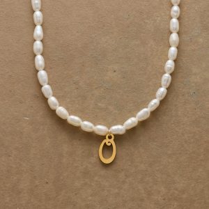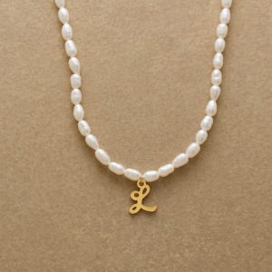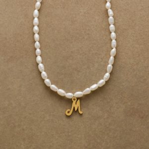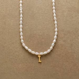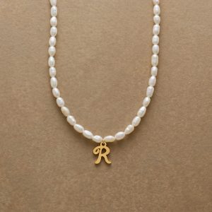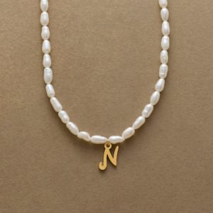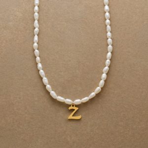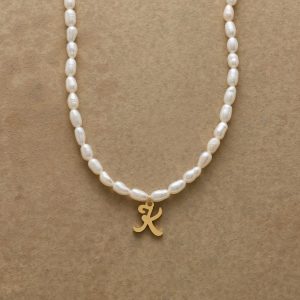 A letter-perfect example of everyday elegance. this string of freshwater pearls can be customized with a script alphabet charm. Charm and lobster clasp made of 14kt gold-plated stainless steel. Handcrafted with silk cord. USA. 15??6 1/2l.