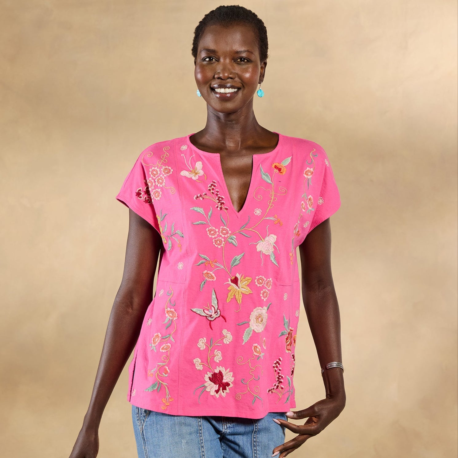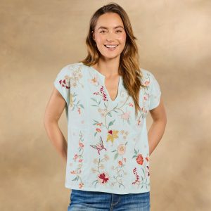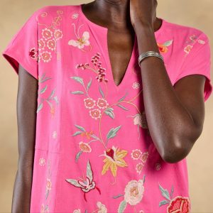 Beautiful floral and geometric embroidery flutters across the front and back of this easy-fit. notch neck top with cap sleeves and side slits. Cotton. Machine wash. Imported. Sizes XS (4). S (6). M (8-10). L (12). XL (14). XXL (16). Approx. 26l.